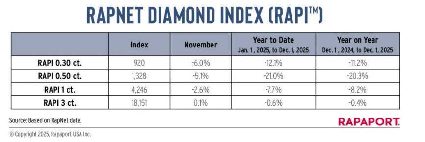 具体而言,高端大克拉(3 克拉以上)、高色高净度(如D色IF净度)钻石因稀缺性和投资需求支撑,价格保持稳定甚至微涨,2025年3克拉以上钻石RAPI仅微跌0.4%;而0.3-0.5克拉等小颗粒日常消费级钻石,受培育钻石冲击和需求疲软影响,价格跌幅显著,2025年0.5克拉钻石全年跌幅超过20%。