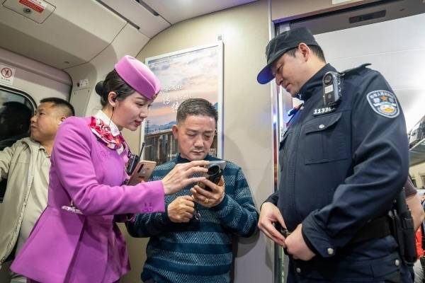 作为今年春运期间广州至重庆方向的首趟夜间高铁,该车次沿途停靠肇庆东、贵阳东等关键站点,精准覆盖粤西至渝黔的务工返乡热门线路,让沿线务工人员无需中转即可直达家乡。为保障夜间长途运行的安全与舒适,重庆客运段与铁路公安机关联动推出多项定制化服务:通过12306APP提前推送到站信息,搭配乘务员逐座提醒的“双保险”模式,彻底解决旅客夜间乘车易坐过站的顾虑;列车班组推行“一车一流程”服务标准,提前规划专属大件行李存放区,为旅客免费增配保暖毛毯、耳塞,根据夜间出行特点动态调整广播音量,营造安静舒适的休息环境。