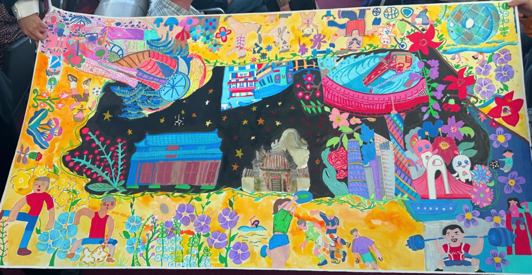 这幅由中法共创的画作长约1米,宽0.8米。作者共10人,年龄最小10岁,最大26岁,除3人是广州市少年宫美术部的普通孩子外,其余都是在融合教育部接受长期培训,患有孤独症、唐氏综合症、智力障碍的特殊青少年。
