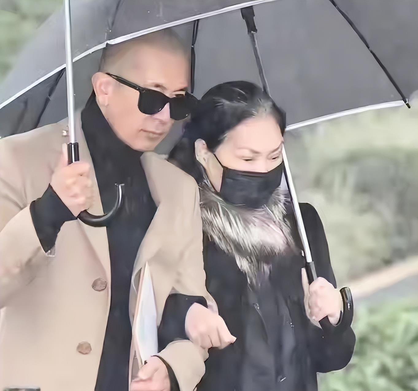 黄春梅挽着具俊晔的胳膊,大家都穿着黑色衣服,表达自己的哀思。