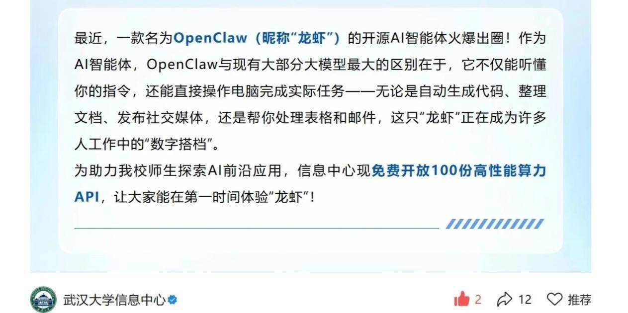 3月10日,武汉大学信息中心一项特别的“福利”在校园里悄然上线——免费向学生发放100份高性能算力API,用于体验一款名为OpenClaw(昵称“龙虾”)的开源AI智能体。消息通过学校公众号发布后,迅速点燃了学生们的热情。